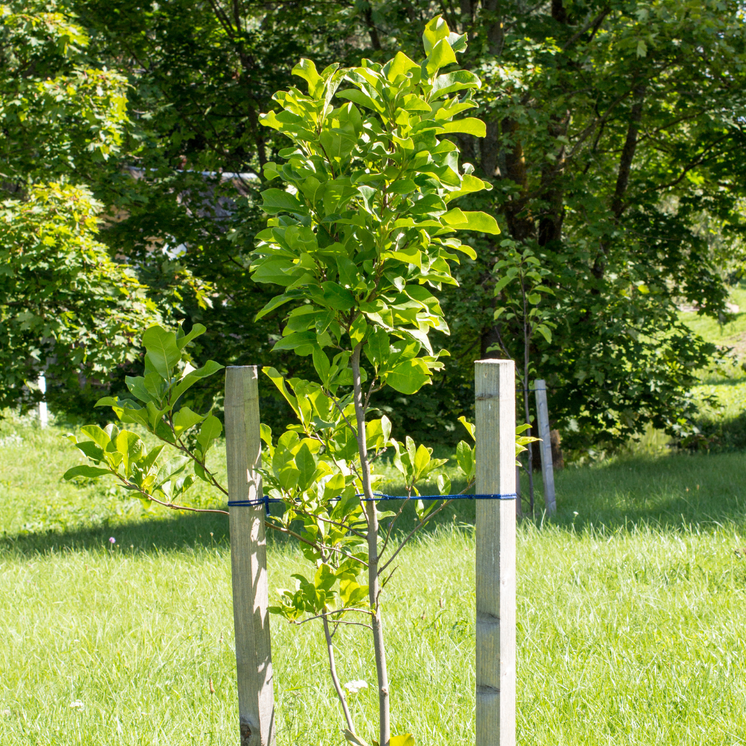 Remove stakes after one growing season to allow the tree to strengthen on its own.